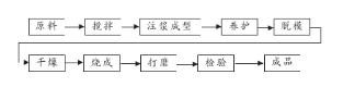 采用目前輕質(zhì)莫來石保溫磚生產(chǎn)常用的注漿成型法,自然養(yǎng)護(hù)至脫模后,移入強(qiáng)制式干燥器中干燥,然后經(jīng)過高溫?zé),燒成坯體經(jīng)過機(jī)械打磨加工即為成品。流程見圖1。
