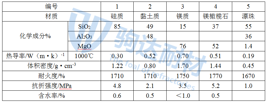 表1為絕熱板的主要性能。從表中看出,其體積密度較小,特別是編號5,屬于超輕型制品;熱導率較低,絕熱性能好。