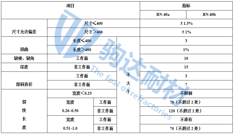 中國(guó)冶標(biāo)(YB/T 5108—1993)規(guī)定了玻璃窯用大型粘土質(zhì)耐火磚的理化指標(biāo)、尺寸允許偏差及外觀,見(jiàn)表2和表3所列。
