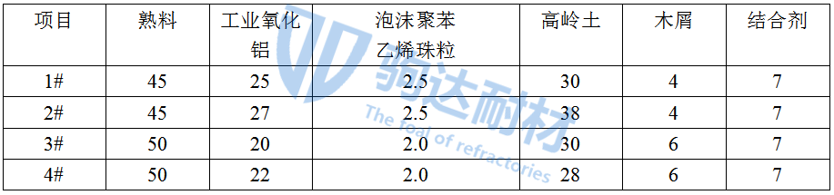 表1 輕質(zhì)莫來石磚配方/%