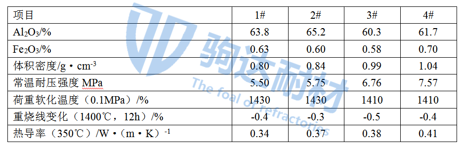 對生產(chǎn)的輕質(zhì)莫來石磚成品進行外觀質(zhì)量檢查和理化性能測試,其外觀顏色較白棱角分明,尺寸較明確,表面無微裂紋。其理化性能見表-2