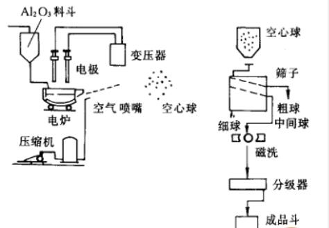 氧化鋁空心球的制備方法有滾球燒失法和熔融噴吹法。滾球法是先用有機(jī)樹脂或低熔物做成芯丸,放在旋轉(zhuǎn)的圓盤里,再把含有一定水分的潮濕的氧化鋁細(xì)粉撒在盤中,粘附在芯丸上,形成一個(gè)外殼,宛如在藥丸外包裹一層糖衣一樣。然后把這種球丸放在高溫下燒成,其中的芯丸燒失揮發(fā)掉,而外殼達(dá)到燒結(jié),形成空心球。這種方法的缺點(diǎn)是效率低,球面不光滑,且壁厚及大小不易控制,因此工業(yè)生產(chǎn)中采用得不多。