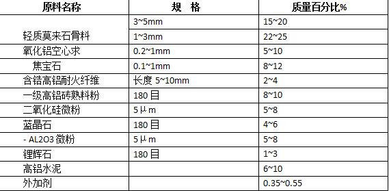 通過選用具有多孔結(jié)構(gòu)的輕質(zhì)莫來石骨料、氧化鋁空心球和導(dǎo)熱系數(shù)較小的含鋯高鋁耐火纖維, 達(dá)到提高爐輥保溫性能, 減少冷卻水帶走的熱損失, 同時(shí)降低體積密度, 減少爐輥的重量與轉(zhuǎn)動的動力消耗的目的;通過0.1~1 mm的焦寶石的加入, 彌補(bǔ)了小于1 mm輕質(zhì)骨料性能劣化的不足, 并通過焦寶石優(yōu)良的熱震穩(wěn)定性與高溫性能, 提高了澆注料的綜合使用性能;通過使用水泥、二氧化硅和-Al2O3微粉作為復(fù)合結(jié)合劑, 引入水合結(jié)合和凝聚結(jié)合兩種凝結(jié)硬化機(jī)理, 提高材料的低、中和高溫強(qiáng)度;通過加入少量鋰輝石粉的燒結(jié)促進(jìn)作用, 改善澆注料使用條件下的燒結(jié)狀況, 促進(jìn)爐輥澆注料隔熱襯使用條件下高溫陶瓷結(jié)合相的形成, 提高隔熱襯的抗破損能力;通過添加含鋯高鋁耐火纖維, 利用其在基體中的拉拔作用所產(chǎn)生的增強(qiáng)、增韌效應(yīng), 提高爐輥澆注料抗機(jī)械振動能力和抗沖擊韌性;通過添加藍(lán)晶石粉作為膨脹劑, 利用藍(lán)晶石高溫下不可逆分解為莫來石和游離的Si O2而產(chǎn)生體積膨脹, 抵消澆注料高溫下體積收縮, 防止?jié)沧⒘吓c金屬輥身之間熱膨脹不匹配造成的澆注料層開裂和脫落;通過減水劑、有機(jī)消泡劑和硅烷偶聯(lián)劑等外加劑的使用, 提高了澆注料的施工流動性, 降低了澆注料的加水量, 改善了爐輥澆注隔熱襯施工質(zhì)量與綜合性能。