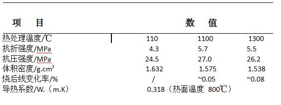按優(yōu)化配方稱料, 混合均勻后加水?dāng)嚢琛沧⒊尚蜑?0mm×40 mm×160 mm試樣, 常溫自然養(yǎng)護(hù)24小時(shí), 脫模后于110℃烘干24 h, 部分試樣繼續(xù)在1100和1300℃熱處理3 h, 然后按相關(guān)標(biāo)準(zhǔn)檢測不同溫度處理后試樣的體積密度、抗折和抗壓強(qiáng)度、導(dǎo)熱系數(shù)等物理性能, 具體數(shù)據(jù)如表2所示。相對常規(guī)爐輥重質(zhì)澆注料 (體積密度2.2g·cm-3, 導(dǎo)熱系數(shù)0.738 W· (m·K) -1) 而言, 體積密度降低25.8%, 具有更輕的容重, 導(dǎo)熱系數(shù)降低約57%, 具有更加優(yōu)良的隔熱效果。同時(shí), 研制的輕質(zhì)隔熱澆注料具有較高的低、中、高溫強(qiáng)度, 隨著溫度的升高, 澆注料的力學(xué)性能比較穩(wěn)定, 沒有發(fā)生大的波動。可見通過配方中多種外加劑的合理設(shè)計(jì), 大幅提高了輕質(zhì)澆注料的抗折、抗壓強(qiáng)度和抗機(jī)械振動能力, 澆注料常溫抗壓強(qiáng)度達(dá)到24.5 MPa, 遠(yuǎn)高于普通輕質(zhì)澆注料的力學(xué)性能, 不僅滿足了脫模及搬運(yùn)要求, 還完全滿足了爐輥300℃烘烤完畢直接入爐使用的要求, 經(jīng)各溫度處理后線變化率較小, 表明有較好的體積穩(wěn)定性。